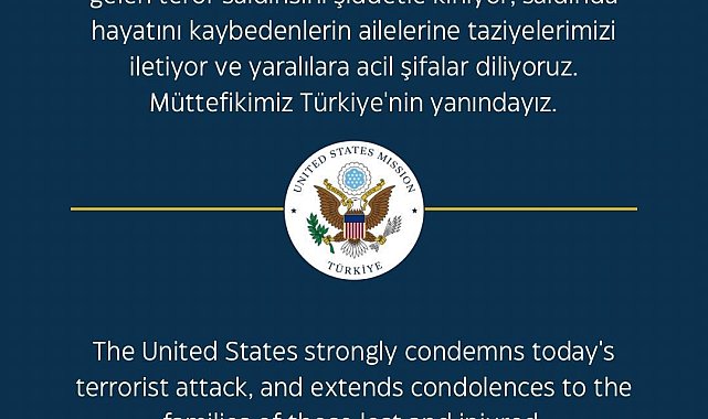 ABD'nin Ankara Büyükelçiliği, TUSAŞ'a düzenlenen terör saldırısını kınayarak, "Müttefikimiz Türkiye'nin yanındayız" açıklamasını yaptı.ABD'nin Ankara Büyükelçiliğinden TUSAŞ'a yönelik düzenlenen terör saldırısına ilişkin yayınlanan mesajda, "ABD olarak bugün meydana gelen terör saldırısını şiddetle kınıyor, saldırıda hayatını kaybedenlerin ailelerine taziyelerimizi iletiyor ve yaralılara acil şifalar diliyoruz. Müttefikimiz Türkiye'nin yanındayız" denildi.