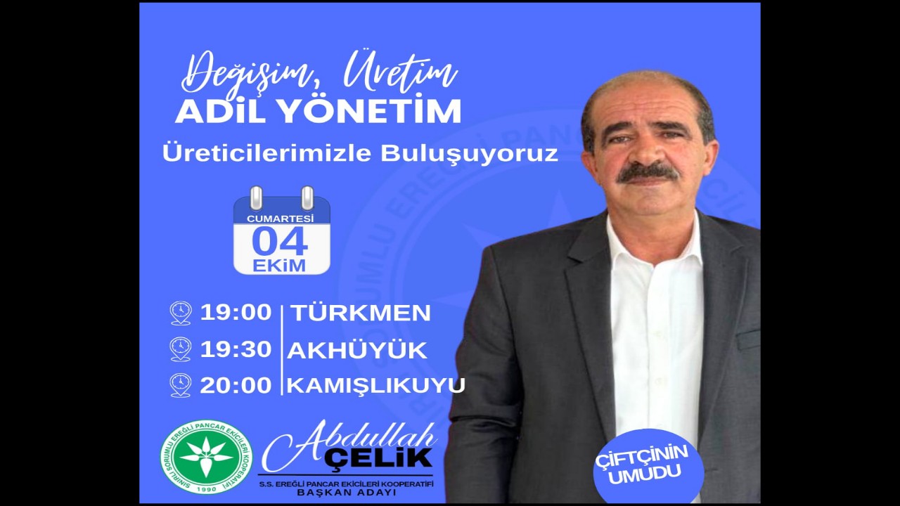 Ereğli Pancar Ekicileri Kooperatifi Başkan Adayı Abdullah Çelik, seçim çalışmalarını köy köy, mahalle mahalle sürdürmeye devam ediyor. Çiftçilerin sorunlarını yerinde dinleyen ve çözüm projelerini anlatan Çelik, bu kez Karaman’ın Türkmen, Akhüyük ve Kamışlıkuyu mahallelerinde üreticilerle buluşacak.