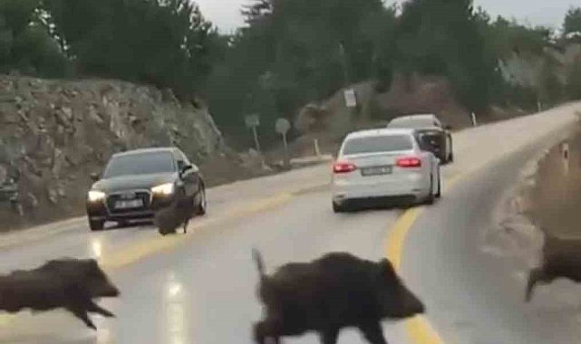 Bursa'da yemek bulamayan domuzlar karayoluna indi.Ormanda yiyecek bulamayan domuz sürüsü Bursa Keles karayoluna inerek yemek aradı. Onlarca domuzu gören sürücüler ise büyük şaşkınlık yaşadı.Vatandaşları görünce kaçan ve zor anlar yaşadıktan sonra gözden kaybolan domuz sürüsünün o anları cep telefon kamerasına yansıdı.