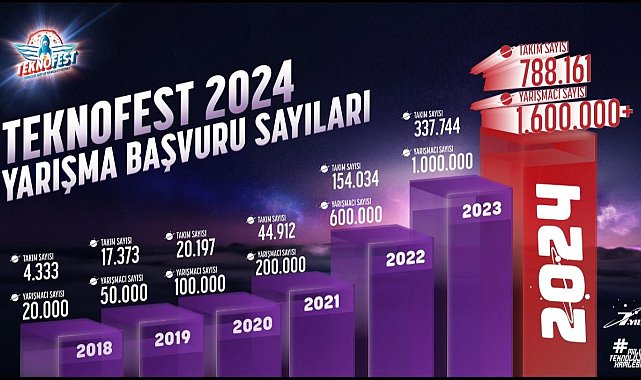 Bu sene Adana'da düzenlenecek TEKNOFEST 2024, 1 milyon 630 bin yarışmacı başvurusu ile rekor kırdı.Türkiye Teknoloji Takımı Vakfı (T3 Vakfı) ve Sanayi ve Teknoloji Bakanlığı iş birliğinde düzenlenen TEKNOFEST, bu yıl Adana'da düzenlenecek. TEKNOFEST resmi sosyal medya hesabından yapılan açıklamada, 1 milyon 630 bin yarışmacı başvurusu ile başvuru rekoru kırıldığı duyuruldu. Geçen yıla göre katılımcı sayısında önemli bir artış gözlenen TEKNOFEST 2024, 788 bin 161 takımı ağırlayacak.