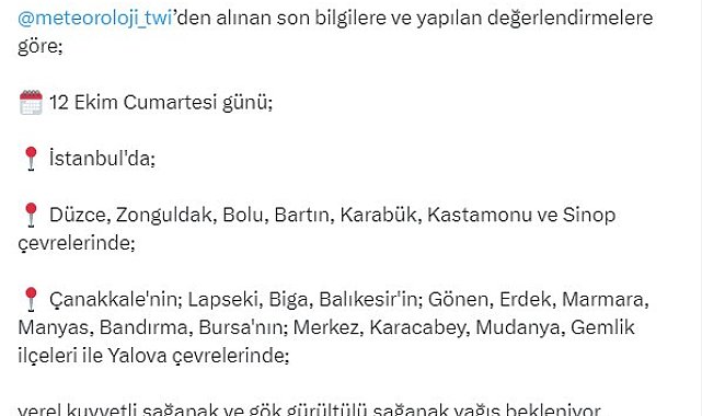 AFAD'dan yapılan açıklamada, bugün İstanbul, Düzce, Zonguldak, Bolu, Bartın, Karabük, Kastamonu ve Sinop çevrelerinde yerel kuvvetli ve gök gürültülü sağanak yağış beklendiği belirtildi. Açıklamada, Çanakkale'nin Lapseki, Biga, Balıkesir'in Gönen, Erdek, Marmara, Manyas, Bandırma, Bursa merkez, Karacabey, Mudanya, Gemlik ilçeleri ile Yalova çevrelerinde de yerel kuvvetli sağanak ve gök gürültülü sağanak yağış beklendiği bildirilirken, vatandaşların ani sel, su baskını, yıldırım, yerel küçük çaplı dolu yağışı, ani kuvvetli rüzgar ve kısa süreli fırtına ile ulaşımda aksamalara karşı dikkatli olmaları istendi.