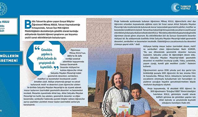 Milli Eğitim Bakanlığı (MEB) Cumhuriyet'in 100. Yılına özel, hayal gücü sınır tanımayan öğrenci ve öğretmenlere ait başarı hikayeleri ile iyi uygulama örneklerinin yer aldığı "Maarifin Yüz Akı" e-dergisi yayımlandı.Sosyal Bilgiler Öğretmeni Mihraç Kulu'nun Bitlis'te 2014-2022 yılları arasında yaptığı projeler de MEB'in Cumhuriyet'in 100. yılına özel "Maarifin Yüz Akı" e-dergisinde ilk 20'ye giren öğretmenlerin ilham verici uygulama örnekleri arasında yer aldı. Milli Eğitim Bakanlığından (MEB), yapılan açıklamaya göre, MEB Strateji Geliştirme Başkanlığınca yayımlanan "Maarifin Yüz Akı" e-dergisinde, yenilikçi çözümler üreten, hayal gücü sınır tanımayan öğrenci ve öğretmenlere ait başarı hikayeleri, fark oluşturan proje çalışmaları ve ilham verici uygulama örnekleri yer aldı. Bakanlığın merkez ve taşra teşkilatı birimleri ile birlikte hareket edilerek toplam 10 binin üzerinde iyi uygulama incelendi. Türkiye'nin tüm illerinden, farklı branş ve kademelerden öğretmen kategorisinde 20, öğrenci kategorisinde 54 ve eğitim kurumları kategorisinde 26 çalışma olmak üzere toplam 100 iyi uygulama örneğine yer verildi. 2014 ile 2022 yılları arasında Bitlis'in Tatvan ilçesinde görev yapan Sosyal Bilgiler Öğretmeni Mihraç Kulu'nun, 2021 yılında Ahlat Selçuklu Meydan Mezarlığı'ndaki tarihi mezar taşları üzerinde bulunan motiflerden yola çıkarak uyguladığı 'Sonsuz Geometrik Desenler Atölyesi projesi ve 2016 yılında köy çocuklarını sinemayla buluşturduğu 'Tarihe Yolculuk' projeleri ilham verici uygulama örnekleri arasında ilk 20'ye girdi.Yaptığı projeyle MEB'in Cumhuriyet'in 100. Yılına özel yayınladığı "Maarifin Yüz Akı" dergisinde 10 bin proje içerisinde ilk 20'ye giren öğretmenler arasında bulunmanın gururunu yaşadığı belirten Sosyal Bilgiler Öğretmeni Mihraç Kulu, bu süreçte başta eşi olmak üzere destek verenlere teşekkür etti.