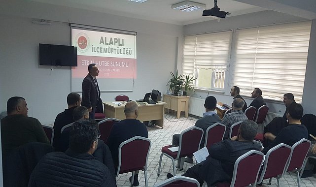 Alaplı İlçe Müftülüğü , Hizmet İçi Eğitim Programı çerçevesinde personeline yönelik "Etkili Hutbe Sunumu" semineri düzenledi.Zonguldak'ın Alaplı İlçesi Hafız Haydar Çaturoğlu'nda gerçekleştirilen 3 gün süren seminerde, katılımcılara hutbelerin hazırlanması, sunulması, ses ve diksiyon teknikleri, hitabet sanatları gibi konularda bilgiler verildi. Kur'an ı Kerim tilavetiyle başlayan seminerde açılış konuşması yapan İlçe Müftüsü Dr. Yılmaz Çelik," Cami hizmetlerinin geliştirilmesi, bu hizmetleri yürüten görevlilerimizin mesleki yeterliklerinin artırılması, etkin ve verimli din hizmeti sunmalarına katkı sağlanması amacıyla 27-30 Kasım tarihleri arasında Hafız Haydar Çaturoğlu Kur'an Kursumuzda 20 personelimize"Etkili Hutbe Semineri" düzenledik. Seminerimizde, "İrşat Yöntemi Olarak Hutbe ve Hatiplik, Hutbe Adabı, Hatibin Temel Nitelikleri, Ses ve Nefes Kullanımı, Türkçeyi Kullanma ve Güzel Konuşma Becerisi, Hutbe Sunumunda Yapılan Yaygın Hatalar ve Hutbe ile İlgili Fıkhi Konular" başlıklarında sunumlar gerçekleştirdik. Tüm İmam-Hatip ve Müezzin-Kayyım ünvanında olan hocalarımız peyderpey bu seminerlere katılacaklar. Seminerlerimizin etkisinin tesir etmesini ve hayra vesile olmasını Cenab-ı Haktan niyaz ediyorum."dedi. Seminerin son gününde seminere katılan personele Katılım Belgesi takdim edildi.