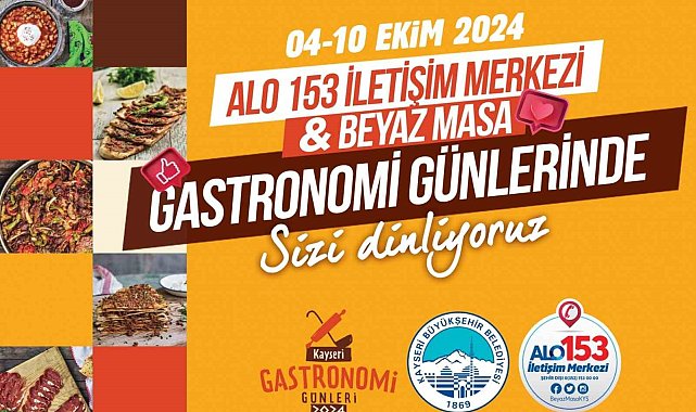 Kayseri Büyükşehir Belediyesi Alo 153 İletişim Merkezi ve Beyaz Masa birimleri; Recep Tayyip Erdoğan Millet Bahçesi'nde ikincisi düzenlenecek olan Kayseri Gastronomi Günleri'nde yerini aldı. Kurulan stantta, festival süresi boyunca ziyaretçilerin talep ve önerilerini dinleyecek.Büyükşehir belediyesi, şehrin farklı noktalarında düzenlenen etkinliklerde Basın, Yayın ve Halkla İlişkiler Daire Başkanlığı bünyesindeki Alo 153 İletişim Merkezi ve Beyaz Masa birimleri ile yerini alarak vatandaşı yerinde dinliyor. Bu çerçevede Alo 153 ve Beyaz Masa, Recep Tayyip Erdoğan Millet Bahçesi'nde 4-10 Ekim günleri arasında gerçekleşecek Kayseri Gastronomi Günleri etkinlik alanında vatandaşa daha kaliteli ve verimli hizmet sunabilmek için stant kurdu.Kadim kentin tanıtımını da yapacak olan Büyükşehir personeli, ulaşım hizmetlerinden spor, kültür ve kütüphane hizmetlerine, KAYBİS'ten otoparka, zabıta denetim hizmetlerinden çevre ve veterinerlik hizmetlerine kadar pek çok konuda vatandaşa anlık bilgi verecek.