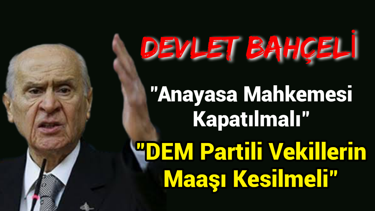 MHP lideri Devlet Bahçeli, DEM partisinin 57 milletvekilinin maaşlarının ve partiye yapılan hazine yardımlarının kesilmesi gerektiğini savunurken Anayasa Mahkemesi'nin kapatılması gerektiğini de sözlerine ekledi.
