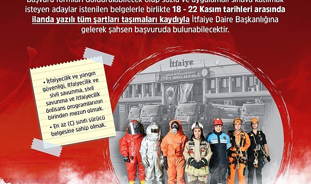 Ankara Büyükşehir Belediyesi KPSS puanıyla 300 itfaiye eri alımı yapacağını açıkladı. Adayların istenilen belgelerle birlikte 18-22 Kasım tarihleri arasında İtfaiye Daire Başkanlığına gelerek şahsen başvurmaları gerekiyor.Ankara Büyükşehir Belediyesi, KPSS puanıyla 300 itfaiye eri alımı için ilana çıktı. "itfaiyebasvuru.ankara.bel.tr" adresi üzerinden başvuru formunu doldurmaları istenen adayların, sözlü ve uygulamalı sınava girmek için istenilen belgelerle birlikte 18-22 Kasım tarihleri arasında İtfaiye Daire Başkanlığına gelerek şahsen başvurmaları gerekiyor. Sözlü ve uygulamalı sınav ise 2-18 Aralık tarihleri arasında İtfaiye Daire Başkanlığında gerçekleştirilecek."Başvurular elektronik ortamdan yapılacak"Adaylar, "itfaiyebasvuru.ankara.bel.tr" adresi üzerinden elektronik ortamda başvuru formları doldurulabilecek. Sözlü ve uygulamalı sınava katılmak isteyen adaylar istenilen belgelerle birlikte 18-22 Kasım tarihleri arasında İtfaiye Daire Başkanlığına gelerek şahsen başvuruda bulunabilecek. Sözlü ve uygulamalı sınav ise 2-18 Aralık tarihleri arasında İtfaiye Daire Başkanlığında gerçekleştirilecek. Toplam 300 kadın ve erkek adayı kapsayan memur alımında açıktan atama yoluyla itfaiye eri alımı yapılacak.