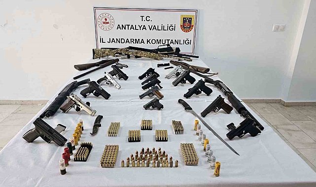 Antalya'da jandarma tarafından 15 adrese yapılan iş zamanlı operasyonda çok sayıda silah ele geçirildi.Serik Cumhuriyet Başsavcılığı talimatları doğrultusunda; Antalya İl Jandarma Komutanlığı/Serik İlçe Jandarma Komutanlığı ekiplerince Serik ilçesindeki 15 ayrı adreste eş zamanlı operasyon yapıldı. Operasyonda 15 adet tabanca, 7 adet av tüfeği, 481 adet dolu fişek, 25 adet şarjör, 1,4 gram metamfetamin, 1 adet döner bıçağı, 2 adet kasatura ile muhtelif miktarda tabanca parçaları ele geçirildi. Olayla ilgili 13 şahıs hakkında adli işlem başlatıldı.