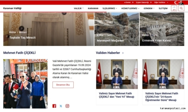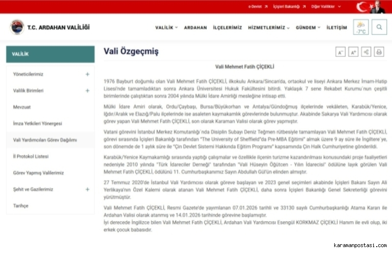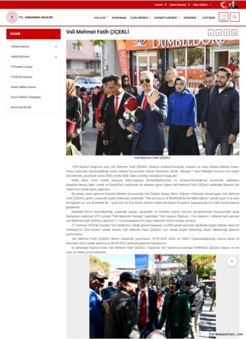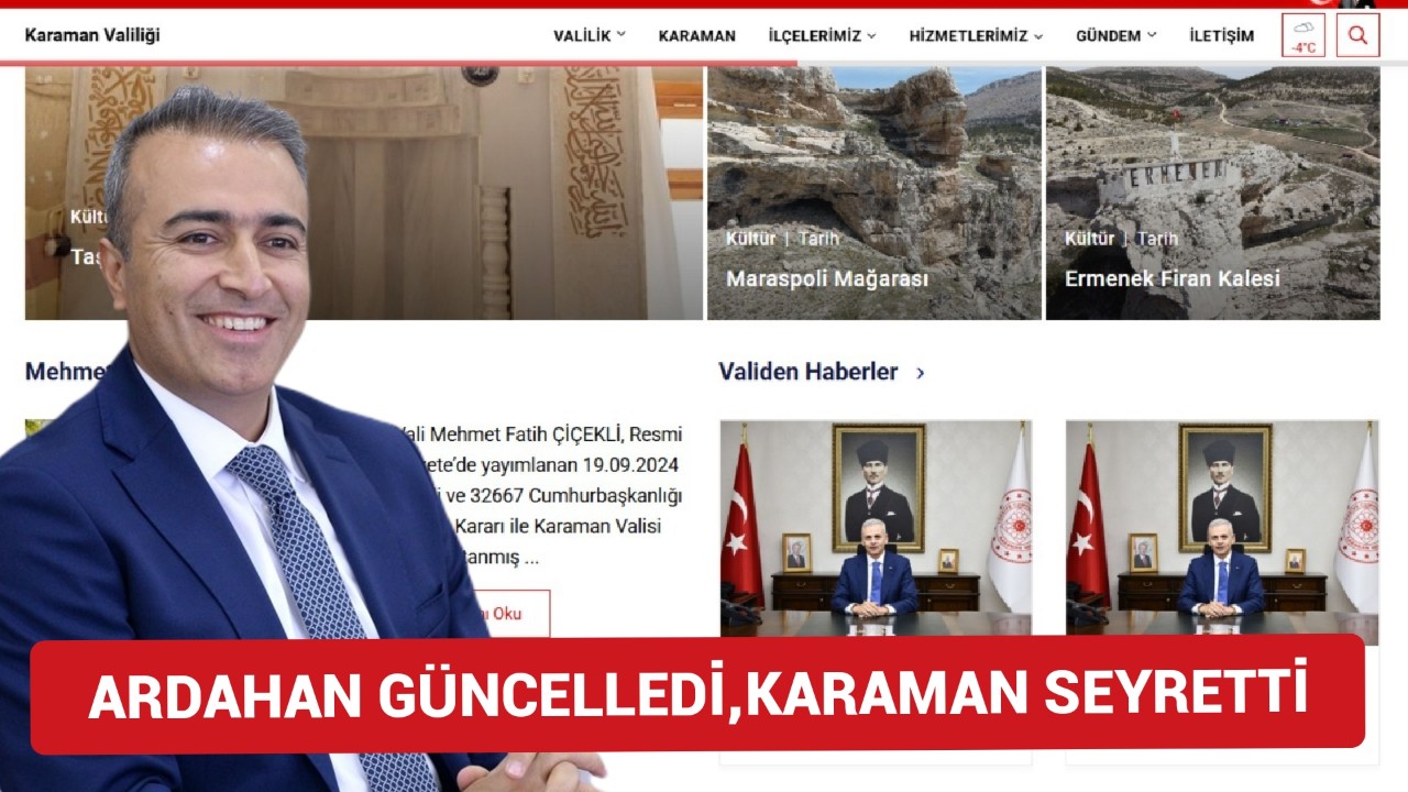 Karaman Valiliği’nin resmî internet sitesinde hâlâ Mehmet Fatih Çiçekli’nin “Karaman Valisi” olarak yer alması, yeni vali Hayrettin Çiçek’in isminin güncellenmemesi ciddi bir kurumsal zaafiyet olarak değerlendiriliyor. Resmî kayıtlara bakıldığında Mehmet Fatih Çiçekli, adeta iki ilin valisiymiş gibi gösteriliyor.