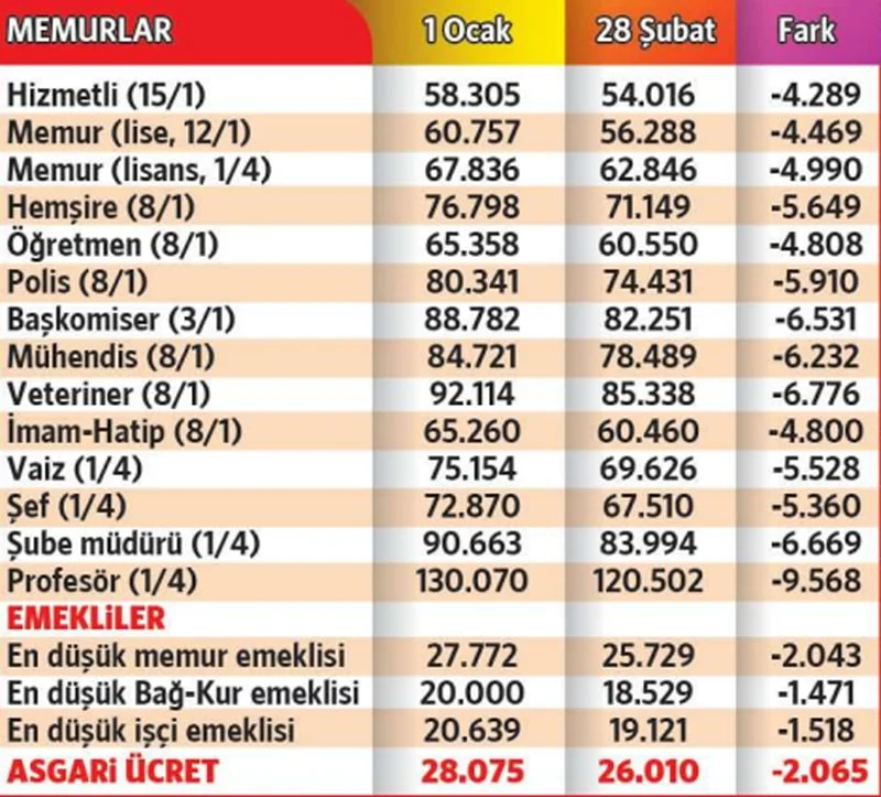 Enflasyonun etkisi memur maaşlarında da hissedildi. Yılbaşında 58 bin 305 lira olarak belirlenen en düşük memur maaşının alım gücü TÜİK verilerine göre 4 bin 289 lira azaldı. ENAG hesaplamalarına göre ise bu kayıp 5 bin 578 liraya ulaştı. TÜİK verileri dikkate alındığında en düşük memur maaşının alım gücü şubat ayı sonunda 54 bin 16 liraya geriledi.Benzer şekilde bazı kamu görevlilerinin maaşlarında da alım gücü kaybı yaşandı. Buna göre öğretmen maaşının alım gücü 4 bin 808 lira, mühendis maaşının alım gücü 6 bin 232 lira ve profesör maaşının alım gücü 9 bin 568 lira azaldı.