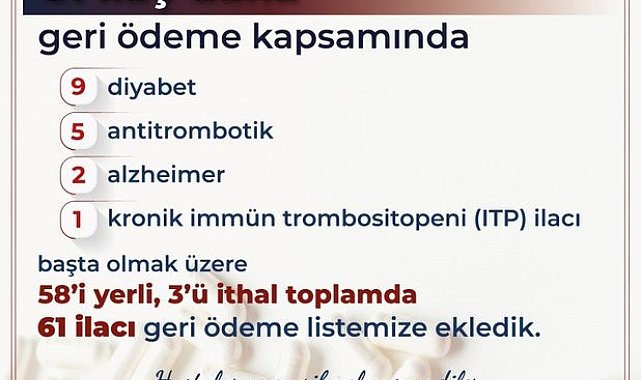 Çalışma ve Sosyal Güvenlik Bakanı Vedat Işıkhan, "Sosyal Güvenlik Kurumumuz tarafından yapılan düzenlemeyle 58'i yerli üretim olmak üzere 61 ilacı daha geri ödeme listesine dahil ediyoruz" dedi.Çalışma ve Sosyal Güvenlik Bakanı Vedat Işıkhan, sosyal medya hesabından yaptığı paylaşımda geri ödeme listesine 61 yeni ilacın eklendiğini duyurdu. Bakan Işıkhan, açıklamasında şu ifadelere yer verdi:"Sosyal Güvenlik Kurumumuz tarafından yapılan düzenlemeyle 58'i yerli üretim olmak üzere 61 ilacı daha geri ödeme listesine dahil ediyoruz. Böylelikle vatandaşlarımıza daha etkin hizmet sunmak için bu yılın ocak-ekim ayları döneminde 397 adet ilacı geri ödeme kapsamına aldık. Geri ödeme listelerimizde yer alan ilaç sayımızı toplamda 8 bin 786'ya çıkardık. İlaçların hastalarımıza şifa olmasını temenni eder, vatandaşlarımıza sağlıklı bir ömür dilerim."