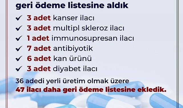 Çalışma ve Sosyal Güvenlik Bakanı Vedat Işıkhan, Sosyal Güvenlik Kurumu (SGK) tarafından 47 ilacın geri ödenme listesine alındığını açıkladı.Çalışma ve Sosyal Güvenlik Bakanı Vedat Işıkhan, sosyal medya hesabından yaptığı açıklamada, 'Bedeli Ödenecek İlaçlar Listesi'nde yeni düzenleme yapıldığını belirtti. SGK tarafından yapılan düzenleme ile 3 adet kanser ilacı, 3 adet multipl skleroz ilacı, 1 adet immunosupresan ilacı, 7 adet antibiyotik, 6 adet kan ürünü ve 3 adet diyabet ilacı olmak üzere 36'sı yerli toplam 47 ilacın geri ödeme listesine alındığını söyledi.Bakan Işıkhan, şu ifadelere yer verdi:"Sosyal Güvenlik Kurumumuz tarafından yapılan düzenlemeyle 36'sı yerli üretim olmak üzere 47 ilacı daha geri ödeme listesine aldık. İlaçların hastalarımıza şifa olmasını temenni eder, vatandaşlarımıza sağlıklı bir ömür dilerim."
