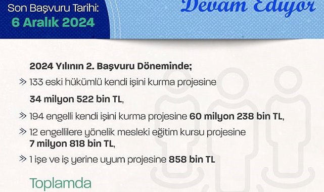 Çalışma ve Sosyal Güvenlik Bakanı Vedat Işıkhan, "Kendi işini kurmak, istihdama ve üretime dahil olmak isteyen engelli vatandaşlarımız ile eski hükümlü vatandaşlarımıza 340 proje için 103 milyon 436 bin lira kaynak tahsis ettik" dedi.Çalışma ve Sosyal Güvenlik Bakanı Vedat Işıkhan, engelli ve eski hükümlü hibe desteği başvurularına ilişkin sosyal medya hesabından açıklamalarda bulundu. Buna göre 2024 yılının ikinci döneminde 133 eski hükümlü kendi işini kurma projesine 34 milyon 522 bin lira, 194 engelli kendi işini kurma projesine 60 milyon 238 bin lira, 12 engellilere yönelik mesleki eğitim kursu projesine 7 milyon 818 bin lira, 1 işe ve iş yerine uyum projesine 858 bin lira ve toplamda 340 proje için 103 milyon 436 bin lira kaynak tahsis edildiğini belirtti. Bakan Işıkhan, açıklamasında şu ifadelere yer verdi:"İŞKUR aracılığıyla kendi işini kurmak, istihdama ve üretime dahil olmak isteyen engelli vatandaşlarımız ile eski hükümlü vatandaşlarımıza yönelik desteklerimizi sürdürüyoruz. Bu yılın ikinci döneminde 340 proje için 103 milyon 436 bin lira kaynak tahsis ettik."