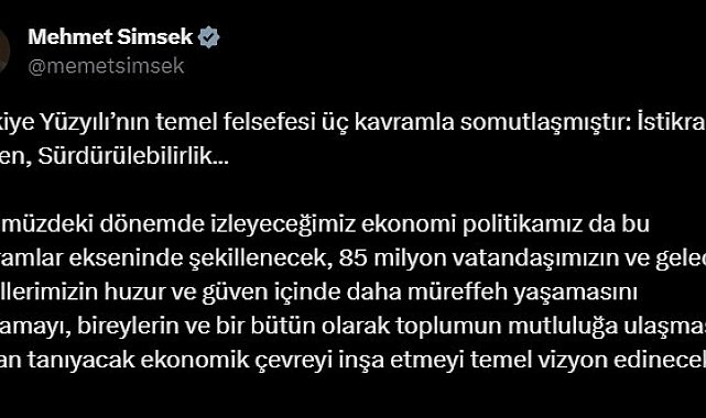 Hazine ve Maliye Bakanı Mehmet Şimşek, piyasada öngörülebilirliğin güven ile sağlanabileceğini hatırlatarak, "Güven, ancak kurala göre politikalar uygulanarak temin edilebilir" dedi.Hazine ve Maliye Bakanı Mehmet Şimşek, Merkez Bankası'nın faizi yüzde 15'e çıkarmasını sosyal medya hesabından yaptığı paylaşımla değerlendirdi.Şimşek açıklamasında, Türkiye Yüzyılı'nın temel felsefesinin istikrar, güven ve sürdürebilirlik kavramı ile somutlaştığını savunarak, "Önümüzdeki dönemde izleyeceğimiz ekonomi politikamız da bu kavramlar ekseninde şekillenecek, 85 milyon vatandaşımızın ve gelecek nesillerimizin huzur ve güven içinde daha müreffeh yaşamasını sağlamayı, bireylerin ve bir bütün olarak toplumun mutluluğa ulaşmasına imkan tanıyacak ekonomik çevreyi inşa etmeyi temel vizyon edinecektir" dedi."Güven, ancak kurala göre politikalar uygulanarak temin edilebilir"Şimşek, refah ve kalkınma için sürdürülebilir büyümenin vazgeçilmez önşartı olduğunu belirterek, "Sürdürülebilir büyüme bir yandan yatırımlar ve istihdam artışı diğer yandan da verimlilik artışı ile sağlanır. Yatırım ve istihdam kararları için en önemli belirleyici etken öngörülebilirliktir. Finansman şartları çok elverişli de olsa, karlılık çok cazip de görünse öngörülebilirlik olmadan kalıcı yatırım ve istihdam artışı sağlamak mümkün değildir. Öngörülebilirliği sağlayacak olan ise güvendir. Güven, ancak kurala göre politikalar uygulanarak temin edilebilir" ifadelerini kullandı.Fiyat istikrarına odaklanan ve finansal istikrarı gözeten kurala dayalı para politikasının, kamu kesimi mali dengesinde istikrarlı bir yapıyı ve sürdürülebilir bütçe finansmanını hedefleyen kurala dayalı öngörülebilir maliye politikasının ve piyasa ekonomisi, serbest kambiyo rejimi, dışa açık ekonomi ilkelerine dayalı politika çerçevesinin Türkiye'ye ciddi miktarda sermaye akımı sağlayacağına dikkati çeken Şimşek, "Bu ise yatırımların ve üretimin finansmanını çok daha kolay hale getirecek, Türk lirasının yeniden istikrar kazanmasını, güvenilir bir para birimi haline gelmesini sağlayacaktır. Paramızın istikrarlı ve güvenli olması, dolarizasyon belasından kurtulmak için en etkili çözümdür" değerlendirmesini yaptı.Şimşek, ekonomi felsefelerinin temelinin teşebbüs hürriyeti, piyasa ekonomisi, dışa açık serbest kambiyo rejimi, dalgalı kur sistemi ve enflasyon hedeflemesi modeli ilkeleri tarafından belirlenen çerçeveye dayandığını belirten Şimşek, "Bugün Merkez Bankası'nın aldığı kararı bu çerçevede değerlendirmek gerek" dedi.