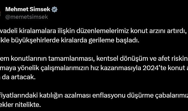 Hazine ve Maliye Bakanı Mehmet Şimşek, kira fiyatlarındaki gerilemeye ilişkin, "Kira fiyatlarındaki katılığın azalması enflasyonu düşürme çabalarımızı destekler nitelikte" dedi.Bakan Şimşek, sosyal medya hesabı üzerinden kira fiyatlarının üç yıl sonunda gerilemesini değerlendirdi.Şimşek, paylaşımında şu ifadelere yer verdi:"Kısa vadeli kiralamalara ilişkin düzenlemelerimiz konut arzını artırdı, özellikle büyükşehirlerde kiralarda gerileme başladı. Deprem konutlarının tamamlanması, kentsel dönüşüm ve afet riskini azaltmaya yönelik çalışmalarımızın hız kazanmasıyla 2024'te konut arzı daha da artacak. Kira fiyatlarındaki katılığın azalması enflasyonu düşürme çabalarımızı destekler nitelikte."