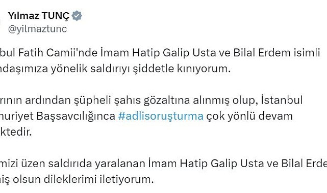 Adalet Bakanı Yılmaz Tunç, Fatih Camii'nde imama ve bir vatandaşa yapılan saldırı ile ilgili soruşturmanın çok yönlü olarak devam ettiğini belirterek, "Hepimizi üzen saldırıda yaralanan İmam Hatip Galip Usta ve Bilal Erdem'e geçmiş olsun dileklerimi iletiyorum" dedi.Adalet Bakanı Yılmaz Tunç, İstanbul'da Fatih Camii İmamı Galip Usta'ya yönelik saldırıya ilişkin sosyal medya hesabından açıklama yaptı. Bakan Tunç, "İstanbul Fatih Camii'nde İmam Hatip Galip Usta ve Bilal Erdem isimli vatandaşımıza yönelik saldırıyı şiddetle kınıyorum. Saldırının ardından şüpheli şahıs gözaltına alınmış olup, İstanbul Cumhuriyet Başsavcılığınca adli soruşturma çok yönlü devam etmektedir. Hepimizi üzen saldırıda yaralanan İmam Hatip Galip Usta ve Bilal Erdem'e geçmiş olsun dileklerimi iletiyorum" ifadelerine yer verdi.