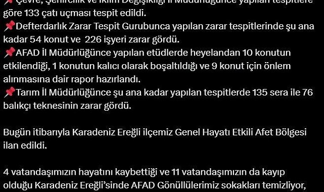 İçişleri Bakanı Ali Yerlikaya, Zonguldak'ın Karadeniz Ereğli ilçesinin meydana gelen heyelan ve sel felaketleri nedeniyle 'Genel Hayata Etkili Afet Bölgesi' ilan edildiğini açıkladı.İçişleri Bakanı Ali Yerlikaya sosyal medya hesabından yaptığı açıklamada, "Zonguldak ilimizde 19 Kasım Pazar günü yaşanan kuvvetli yağışlar sonucu Karadeniz Ereğli ilçesinde meydana gelen heyelan ve sel afetleri nedeniyle Çevre, Şehircilik ve İklim Değişikliği İl Müdürlüğünce yapılan tespitlere göre 133 çatı uçması tespit edildi. Defterdarlık Zarar Tespit Grubunca yapılan zarar tespitlerinde şu ana kadar 54 konut ve 226 iş yeri zarar gördü. AFAD İl Müdürlüğünce yapılan etüdlerde heyelandan 10 konutun etkilendiği, 1 konutun kalıcı olarak boşaltıldığı ve 9 konut için önlem alınmasına dair rapor hazırlandı. Tarım İl Müdürlüğünce şu ana kadar yapılan tespitlerde 135 sera ile 76 balıkçı teknesi zarar gördü. Bugün itibarıyla Karadeniz Ereğli ilçemiz 'Genel Hayata Etkili Afet Bölgesi' ilan edildi. 4 vatandaşımızın hayatını kaybettiği ve 11 vatandaşımızın da kayıp olduğu Karadeniz Ereğli'sinde AFAD gönüllülerimiz sokakları temizliyor, su basan iş yeri ve evlerde hayatın normale dönmesi için canla başla çalışıyor. Karadeniz Ereğli'sindeki hemşehrilerime tekrar geçmiş olsun dileklerimi sunuyorum. AFAD gönüllülerimizin her birine ayrı ayrı teşekkür ediyorum" dedi.