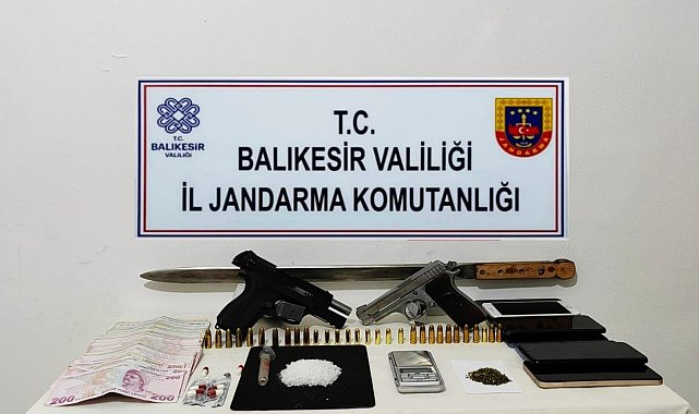 Balıkesir'in Altıeylül ilçesinde jandarma ekipleri 4 şüpheli şahsa yönelik olarak ikamet ve araçlarında yaptıkları operasyonda uyuşturucu madde, 2 ateşli silah, mermi ve suçtan elde edildiği düşünülen 26 bin 600 lira para ele geçirildi. Adli makamlara sevk edilenlerden 2'si tutuklandı.Balıkesir İl Jandarma Komutanlığınca, uyuşturucu madde imal ve ticaretine yönelik yapılan istihbari çalışmalar neticesinde; Altıeylül ilçesinde uyuşturucu madde imal ve ticareti suçu işlediği tespit edilen şüphelilere ait 1 ikamet ve 2 araçta icra edilen operasyon sonucu; 26 gram metamfetamin, 6 gram kubar esrar, 6 adet sentetik uyuşturucu hap, 1 adet hassas terazi, 1 adet uyuşturucu kullanma aparatı, 2 adet tabanca, 2 adet tabanca şarjörü, 30 adet tabanca mermisi ve 26 bin 600 TL suçtan elde edilen gelir ele geçirildi.Olayla ilgili 4 şüpheli yakalanarak gözaltına alınmış olup, sevk edildikleri mahkeme tarafından 2 şüpheli hakkında tutuklama kararı, 2 şüpheli hakkında ise adli kontrol tedbir kararı verildi.Emniyet, asayiş ve kamu düzeninin sağlanması ile suçların azaltılması, önlenmesi ve suçluların yakalanmasına yönelik çalışmalara aralıksız olarak devam edileceği açıklandı.