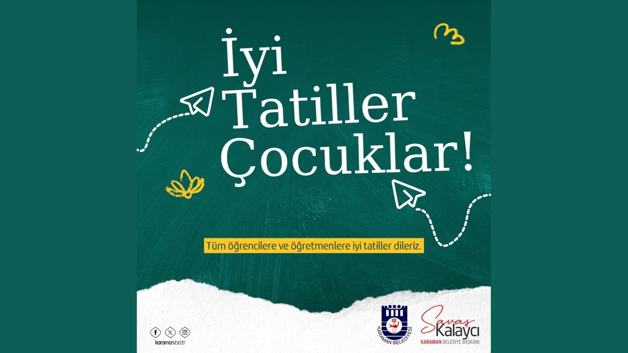 karaman Belediye Başkanı Savaş Kalaycı, 2024-2025 eğitim ve öğretim yılının sona ermesi nedeniyle yayınladığı mesajda, tüm öğrencileri azim ve başarılarından dolayı kutlayarak, onlara keyifli, verimli ve sağlıklı bir yaz tatili diledi.