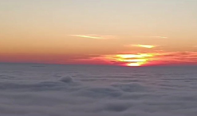 Karlı kaplı dağlar, güneş ve sis birleşince görsel şölen oluştu.