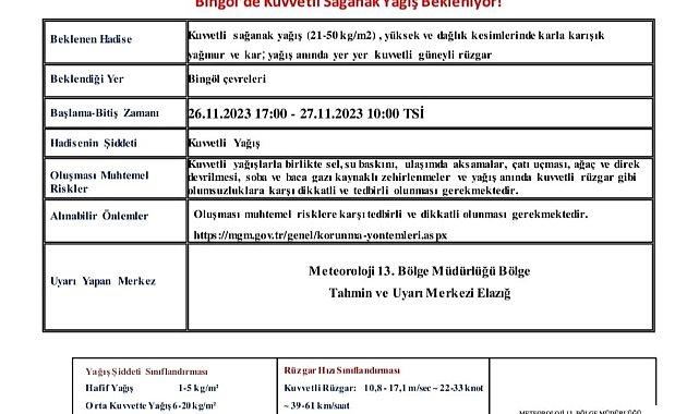 Bingöl Valiliğinden yapılan açıklamada, "Meteoroloji 13. Bölge Müdürlüğü Bölge tahminlerine göre 26.11.2023 saat 17.00 ile 27.11.2023 saat 10.00 arasında kuvvetli sağanak yağış (21-50 kg/m2), yüksek ve dağlık kesimlerinde karla karışık yağmur ve kar yağış anında yer yer kuvvetli güneyli rüzgar beklenmektedir. Kuvvetli yağışlarla birlikte sel, su baskını, ulaşımda aksamalar, çatı uçması, ağaç ve direk devrilmesi, soba ve baca gazı kaynaklı zehirlenmeler ve yağış anında kuvvetli rüzgar gibi olumsuzluklara karşı dikkatli ve tedbirli olunması gerekmektedir. Oluşması muhtemel risklere karşı tedbirli ve dikkatli olunması gerekmektedir" denildi.