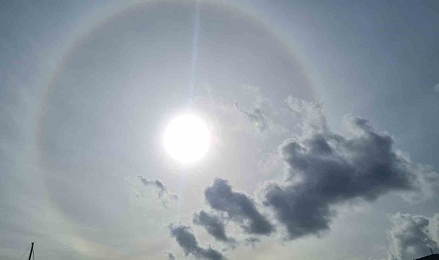 Muğla'nın Bodrum ilçesinde 'güneş halesi' ortaya çıktı. Haleyi fark eden vatandaşlar, bu ilginç görüntüyü kayıt altına aldı.İlçede güneşin etrafında 'güneş halesi' adı verilen halka oluştu. Gökyüzüne bakıp haleyi fark eden birçok vatandaş, o anları görüntüledi.Güneş ışınlarının havadaki buz kristalleri tarafından kırılmasıyla oluşan hale, uzun süre Bodrum semalarında izlendi. O anlar, sosyal medya hesaplarından paylaşıldı.
