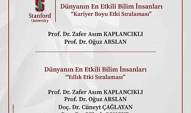 Bilecik Şeyh Edebali Üniversitesi'nden 5 görevli bilim insanı, Stanford Üniversitesi Elsevier iş birliğiyle her yıl hazırlanan 'Dünyanın En Etkili Bilim İnsanları' listesine girdi. Listenin oluşturulmasında nitelikli yayın sayısı, yayınların yer aldığı derginin etkisi, patent sayısı, h-indeks, hm-indeks, makale sayısı, yapılan atıf sayısı gibi uluslararası ölçütler kullanıldı. Listede; 'Kariyer Boyu Etki' ve 'Yıllık Etki' olmak üzere iki farklı kategori yer aldı. Listede Bilecik Şeyh Edebali Üniversitesi Rektörü Prof. Dr. Zafer Asım Kaplancıklı, Mühendislik Fakültesi Öğretim Üyesi Prof. Dr. Oğuz Arslan 'Kariyer Boyu Etki' ve 'Yıllık Etki' sıralamasında listeye girerken; Tıp Fakültesi Öğretim Üyesi Doç. Dr. Cüneyt Çağlayan, Sağlık Hizmetleri Meslek Yüksekokulu Öğretim Üyesi Doç. Dr. Gülşah Çongur ve Mühendislik Fakültesi Öğretim Üyesi Doç. Dr. Mesut Işık 'Yıllık Etki' sıralamasında listede yerlerini aldı.