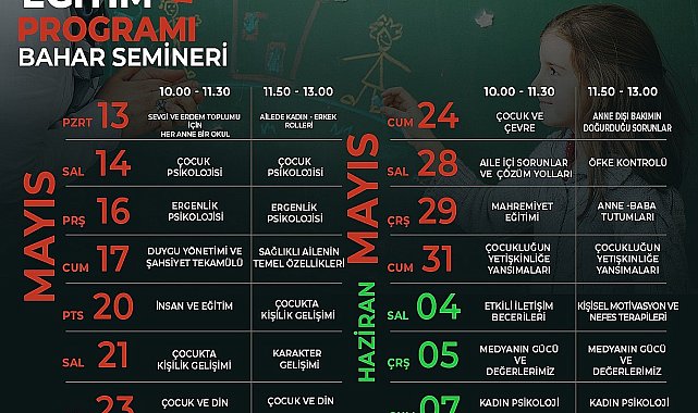 Canik Belediyesi, 'Her Anne Bir Okul' seminer programı yeni dönem kayıtları devam ediyor.Canik Belediyesi'nin anneleri aile yaşamı, ergen ve çocuk psikolojisi başta olmak üzere birçok konu başlığında alanında uzman eğitmenlerle buluşturduğu 'Her Anne Bir Okul' seminer programı başvuruları sürüyor. Mayıs ve haziran ayları boyunca devam edecek olan seminerler çerçevesinde, kişisel gelişim ve etkili iletişim alanlarında da annelere eğitim verilecek.Son başvuru 12 Mayıs'Her Anne Bir Okul' seminer programı 13 Mayıs 2024 ve 7 Haziran 2024 tarihleri arasında Sezai Karakoç Canik Kültür Merkezi'nde gerçekleştirilecek. Eğitimci-yazar Necla Koytak ve eğitimci-yazar Seyhan Büyükcoşkun'un katılımlarıyla annelere özel 21 konu başlığında seminerin düzenleneceği 'Her Anne Bir Okul' seminer program başvuruları, 12 Mayıs'a kadar devam edecek.