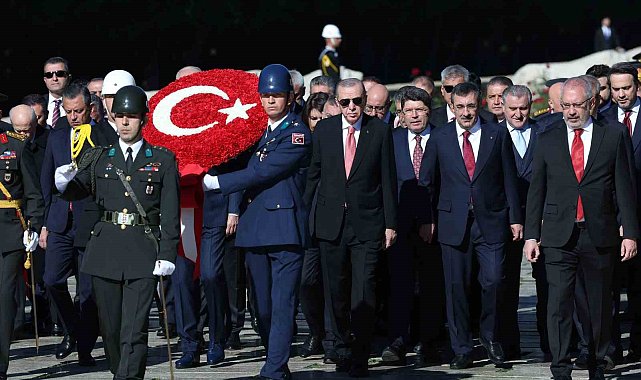 Cumhurbaşkanı Recep Tayyip Erdoğan başkanlığındaki devlet erkanı, 29 Ekim Cumhuriyet Bayramı ve Cumhuriyet'in ilanının 101'inci yıl dönümü dolayısıyla Anıtkabir'i ziyaret etti.Cumhurbaşkanı Erdoğan'ın Aslanlı Yol'un başındaki yerini almasının ardından başlayan törende, Türkiye Büyük Millet Meclisi Başkanı Numan Kurtulmuş, Cumhurbaşkanı Yardımcısı Cevdet Yılmaz, CHP Genel Başkanı Özgür Özel, MHP Genel Başkanı Devlet Bahçeli, Cumhurbaşkanlığı Kabinesi üyeleri, Yüksek Yargı üyeleri, Genelkurmay Başkanı Orgeneral Metin Gürak ve kuvvet komutanları da Aslanlı Yol'dan geçerek mozoleye çıktı.Cumhurbaşkanı Erdoğan'ın üzerinde ay yıldız bulunan çelengi Atatürk'ün mozolesine bırakmasının ardından saygı duruşunda bulunuldu ve İstiklal Marşı okundu.Daha sonra Erdoğan ve beraberindekiler, Misak-ı Milli Kulesi'ne geçti. Cumhurbaşkanı Erdoğan, burada Anıtkabir Özel Defteri'ne şunları yazdı:"Aziz Atatürk, bugün bizlere emanetiniz olan milletimizin en büyük eseri, aynı zamanda iftihar kaynağı olan Cumhuriyetimizin 101. yıl dönümüne ulaşmanın haklı sevincini yaşıyoruz. Bu gurur günümüzde ülkemizde ve dünyanın dört bir yanında yaşayan tüm vatandaşlarımızın kalbi bizimle çarpan tüm soydaşlarımızın 29 Ekim Cumhuriyet Bayramı'nı tebrik ediyorum. Bu vesileyle zatıalinizi, silah arkadaşlarınızı ve aziz şehitlerimizi bir kez daha şükranla yad ediyorum.Bölgemizde sınırların bir asır evvel olduğu gibi yine kan ve gözyaşıyla çizilmek istendiği bir dönemde vatanımızın bekasını, milletimizin güvenliğini korumak için her türlü tedbiri alıyoruz. Milli mücadelenin Cumhuriyetin ilanıyla taçlanmasını sağlayan birlik, beraberlik ve kardeşlik ruhu bu süreçte bizlere de rehberlik etmekte yolumuzu bir fener misali aydınlatmaktadır. Türkiye Cumhuriyeti, emin ve ehil kadroların riyasetinde maziden atiye uzanan muazzam yolculuğunu her zamankinden çok daha kararlı bir şekilde sürdürmektedir. Ruhun şad olsun."Anıtkabir, devlet töreninin ardından halkın ziyaretine açıldı.