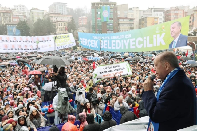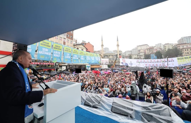 Konuşmasına Rizelileri selamlayarak başlayan Cumhurbaşkanı Erdoğan, ana yurdu, baba ocağı Rize'de olmaktan büyük memnuniyet duyduğunu belirtti. Karşısında Karadeniz misali kabına sığmayan, bendini yıkmaya hazır bir Rize gördüğünü söyleyen Cumhurbaşkanı Erdoğan, "Dereler dize gelir, dökülür bize gelir. Gönlümün bahçesinde birinci Rize gelir. Derelerin derdini balıktan sor balıktan. Rize'ye tutulmayan ne anlar sevdalıktan" dizelerini okudu. “TÜRKİYE'Yİ NE EKONOMİK NE SİYASİ NE DİPLOMATİK OLARAK ESİR ALMALARINA MÜSAADE ETMEDİK” Birilerinin Rize ile birlikte 81 şehrin tamamına olan sevdalarını anlayamadığını belirten Cumhurbaşkanı Erdoğan, şöyle devam etti: "Bizim ezelden ebede uzanan kardeşliğimizi bir türlü idrak edemiyorlar. Tam 22 yıldır Rizeli kardeşlerimizle birlikte yol yürüdük, omuz omuza mücadele ettik. Vesayetçilerden terör örgütlerine, emperyalist güçlerden Türkiye ile ilgili hesabı olan tüm şer odaklarının karşısında birlikte durduk. Cumhuriyet mitingleriyle milletin iradesini gasbetmek istediler. Gezi hadisesiyle sokaklarımızı terörize etmeye kalktılar. 17-25 Aralık girişimiyle hükûmetimizi alaşağı etmeye çalıştılar. Çukur olaylarıyla ülkemizin bir parçasını bizden koparmayı denediler.” Cumhurbaşkanı Erdoğan, “15 Temmuz kanlı darbe teşebbüsüyle doğrudan istiklalimize kastettiler. Teröristlere binlerce tır dolusu silah sağlayarak hemen güneyimizde bir teröristan kurmaya çalıştılar. Ekonomimizi mahvetme, bu tür tehditlerle Türkiye'ye diz çöktürmeye çalıştılar. Bunların hepsini biz, sizlerle beraber boşa çıkardık. Türkiye'yi ne ekonomik ne siyasi ne diplomatik ne de sosyal olarak esir almalarına müsaade etmedik. Sizinle beraber” diye ekledi. “TÜRKİYE İÇİN SAMİMİYETLE ÇALIŞTIK” Türkiye'nin son 21 yılda yazdığı başarı hikâyesinin kahramanı Rize ile birlikte 81 vilayetin tamamı, 85 milyonun her bir ferdi olduğunu vurgulayan Cumhurbaşkanı Erdoğan, "Siz bu kardeşinize sahip çıktınız, bize destek oldunuz. Biz de sizin için Türkiye için samimiyetle çalıştık. Siz bize güvendiniz, inandınız, teveccüh gösterdiniz. Biz de size olan minnet borcumuzu hep daha fazla hizmet ve eser üreterek, hamdolsun, yerine getirdik. Durmadık, usanmadık, Allah ömür, milletimiz de destek verdikçe yolumuza bu çizgide devam edeceğiz" ifadesini kullandı. Rize'nin güçlü duruşunu 31 Mart seçimlerinde yine çok net biçimde ortaya koyacağına inandığını belirten Cumhurbaşkanı Erdoğan, "Ata yurdum, ana ocağım Rize'den 31 Mart'ta yine rekor bekliyorum" dedi. Rize 15 Temmuz Demokrasi ve Cumhuriyet Meydanı yanındaki kentsel dönüşüm alanını göstererek, vatandaşlara nasıl bulduklarını soran Cumhurbaşkanı Erdoğan, "Güzel mi, Rize merkez değişmiş mi, hâlâ değişiyor mu? Yaparsa AK Parti yapar. Daha neler yapacağız neler" dedi. “85 MİLYON OLARAK HEPİMİZ BİRİZ, BERABERİZ, KARDEŞİZ” Cumhurbaşkanı Erdoğan, şunları kaydetti: "85 milyon olarak hepimiz biriz, beraberiz, kardeşiz. Bakınız, bizi yıllarca köken üzerinden, meşrep ve hayat tarzı üzerinden bölmek istediler. Her kesimden insanımızın arasında nifak duvarları ördüler. Geçmişte gerçekten çok zor ve karanlık günler yaşadık. Gençlerimizi, evlatlarımızı, ideolojik kör dövüşüne kurban verdik. Bu kavgalardan en büyük zararı millet ve devlet olarak biz gördük. Ekonomimiz kan kaybetti, toplumsal huzurumuz bozuldu. Kardeş kardeşe, komşu komşuya düşman edildi. Demokrasimiz yıllarca vesayetin gölgesinden çıkamadı. Kendi iç meselelerimizle uğraşmaktan dünyadaki değişimi, dönüşümü, yenilikleri, teknoloji ve sanayi hamlelerini yakalayamadık.” Cumhurbaşkanı Erdoğan, sözlerini şöyle sürdürdü: “Her alanda şampiyonlar liginde oynaması gereken ülkemizi yıllarca ikinci lige mahkûm ettiler. Bu fasit daireyi kırmaya çalışan, devlet ve siyaset adamlarını ise ya şehit ettiler ya linç ettiler ya da elini kolunu bağladılar. Merhum Menderes, ülkeye ve millete hizmetin bedelini canıyla ödedi. Rahmetli Özal'ı hiçbir zaman rahat bırakmadılar. Merhum Türkeş ve Erbakan'a yönelik itibar suikastlarının ardı ve arkası hiç kesilmedi. Türkiye ne zaman belini doğrultmaya, yeniden ayağa kalkmaya, kendini toparlamaya çalışsa birileri hemen devreye girerek buna fırsat vermedi. Ülkemizi içine düştüğü bu cendereden kurtaran hamdolsun biz olduk. Teröristler bizimle baş edemedi. Bunları Gabar'a gömdük, bunları Cudi'ye gömdük, bütün o mağaralara gömmek suretiyle nefeslerini kestik. Şimdi de sınır ötesinde aynen devam ediyoruz." “YAKIN BİR TARİHTE İKİNCİ ASTRONOTUMUZU DA UZAYA GÖNDERECEĞİZ” Siyasete kazandırdıkları istikrar ve güven iklimi sayesinde Türkiye'yi her alanda üç, beş, on kat büyüttüklerini belirten Cumhurbaşkanı Erdoğan, ihracatı 36 milyar dolardan 256 milyar dolara, turist sayısını 13 milyondan 57 milyona çıkardıklarını belirtti. Millî geliri 238 milyar dolardan bir trilyon dolar seviyesine getirdiklerini dile getiren Cumhurbaşkanı Erdoğan, istihdamı 19 milyon kişiden, 32 milyon kişiye taşıdıklarını söyledi. Türkiye'nin savunma sanayinde yüzde 80 dışa bağımlılığını yüzde 20'lere indirdiklerine dikkati çeken Cumhurbaşkanı Erdoğan, "Bugün insansız hava araçlarında dünyanın ilk üç ülkesinden biriyiz. Kızıl Elma ve ANKA-3 ile artık bu alanda farklı bir lige yükseliyoruz. TCG Anadolu'nun ardından geçen ay en büyük ikinci gemimiz olan TCG Derya'yı da donanmamıza teslim ettik. Kendimiz yaptık, dışarıdan değil" diye konuştu. İlk insanlı uzay misyonunun geçen hafta başarıyla tamamlandığını anımsatan Cumhurbaşkanı Erdoğan, "İnşallah, yakın bir tarihte ikinci astronotumuzu da uzaya göndereceğiz. Artık Ahmetler, Mehmetl