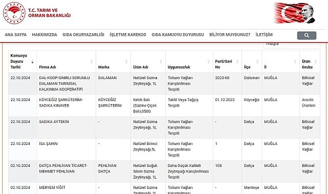 Son açıklanan listede, Dalaman Belediye Başkanı Sezer Durmuş'un başkanlığını yürüttüğü S.S Dalaman Tarımsal Kalkınma Kooperatifi'nin zeytinyağında sahtecilik yaptığı ortaya çıktı. Kooperatif, organik gıda sağlamak ve çiftçilere destek olmak amacıyla kurulmuştu.