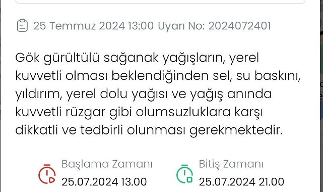 Denizli'nin doğusu ile Afyonkarahisar ve Uşak illeri çevrelerindeki beklenen yerel kuvvetli yağışlara karşı uyarı yapıldı.Meteoroloji 5. Bölge Müdürlüğü Bölge Tahmin ve Erken Uyarı Merkezinden yapılan son değerlendirmelere göre; Perşembe öğle saatlerinden sonra Denizli'nin doğusu ile Afyonkarahisar ve Uşak çevreleri yerel kuvvetli yağışlar bekleniyor. Görülecek gök gürültülü sağanak yağışların neden olabileceği ani sel, su baskını, yıldırım, yerel dolu yağışı, yağış anında kuvvetli rüzgar ve ulaşımda aksamalar gibi olumsuzluklara karşı dikkatli ve tedbirli olunması istendi.Beklenen yerel kuvvetli yağışların Perşembe günü 13.00'ten itibaren başlayıp, akşam saat 21.00 sıralarında etkisini kaybedeceği tahmin ediyor.