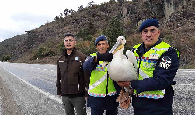 Bolu'da devriye atan jandarma ekipleri, yaralı halde pelikan kuşu buldu. Ekipler tarafından hamsiyle beslenen pelikan kuşu, tedavisi için Doğa Koruma ve Milli Parklar ekiplerine teslim edildi.Mudurnu ilçesinde öğle saatlerinde İlçe Jandarma Komutanlığı Trafik ve Asayiş ekipleri devriyeye çıktı. Ekipler ormanlık alanın yakınlarında uçamayan bir kuşa rastladı. Kuşun yanına giden ekipler pelikan kuşunun yaralı olduğu fark etti. Durum, Doğa Koruma ve Milli Parklar Şube Müdürlüğüne bildirildi.Hamsiyle besledilerEkipler, kuşu kontrol etmek için yanına yaklaştı. O esnada yoldan geçen bir vatandaş kendisi için aldığı hamsilerin bir kısmını jandarmaya verdi. Jandarma ekiplerinin beslemek için attığı balığı ise pelikan, kedi gibi yakaladı. Pelikan kuşu tedavisi yapılarak tekrar doğaya salınmak üzere Doğa Koruma ve Milli Parklar Şube Müdürlüğü Rehabilitasyon Merkezi ekiplerine teslim edildi.