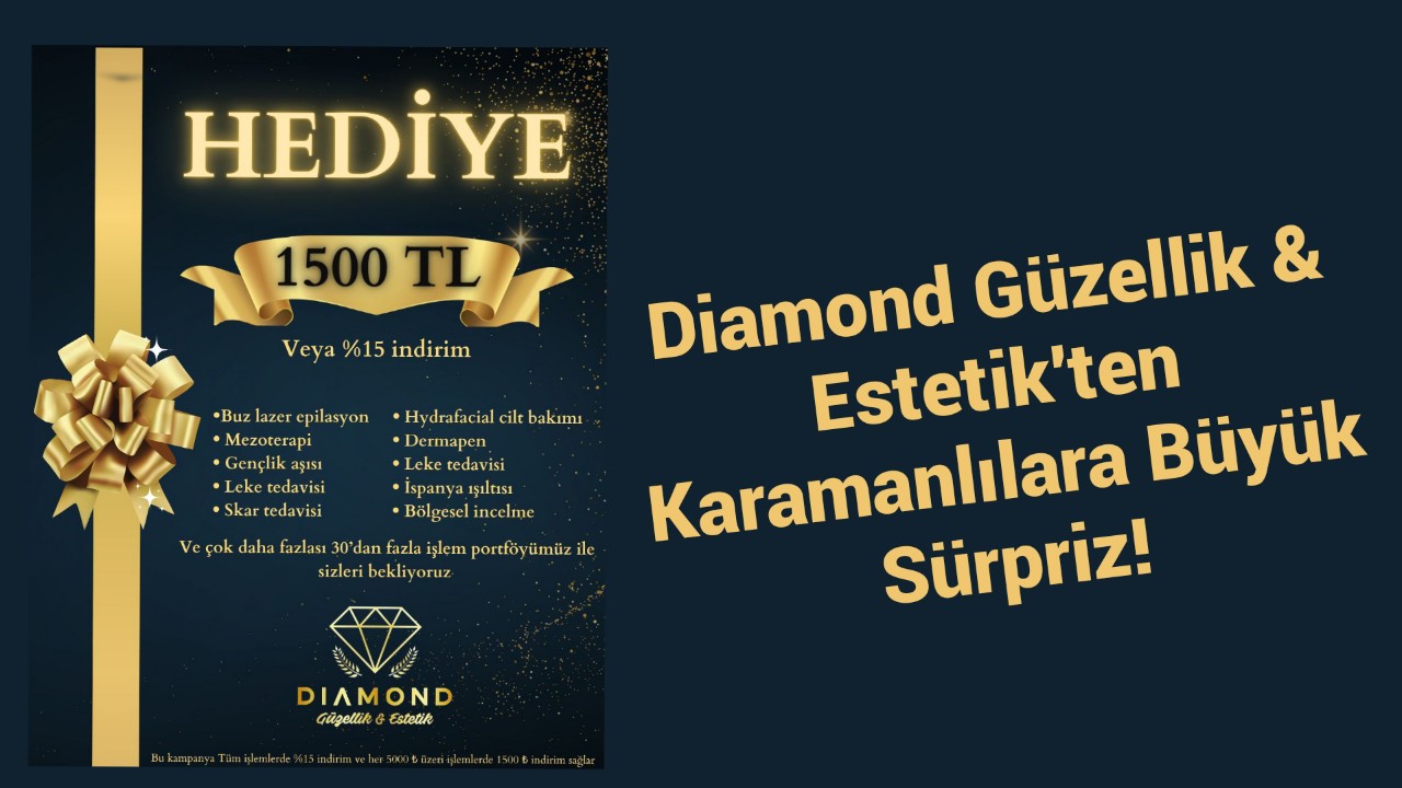 Diamond Güzellik & Estetik’ten Karamanlılara Büyük Sürpriz!Karaman’da güzelliğin ve estetiğin merkezi Diamond Güzellik & Estetik, ilk tanışmaya özel 1500 TL değerinde hediye kuponu veya %15 indirim fırsatı sunuyor!Her 5000 TL ve üzeri tüm işlemlerde geçerli bu özel kampanya ile hem güzelleşin hem de kazanın!Buz Lazer Epilasyon, Cilt Bakımı, Hydrafacial, Altın İğne, Baby Face Beauty, Kirpik Lifting, Dövme Silme ve çok daha fazlası şimdi çok daha ulaşılabilir.Alanında uzman kadrosu, hijyenik ortamı ve profesyonel hizmet anlayışıyla Diamond, güzelliğinizi zirveye taşıyor.Adres: Alişahane Mah. Kemal Kaynaş Cad. No:101/A (Perşembe pazarı içi, Türkoğlu Camii karşısı)0551 963 70 99Instagram: @diamondkaraman