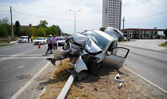 Yaşanan kazada otomobil askıda kalırken, aydınlatma direği ise yerinden sökülerek devrildi. Otomobilde bulunan sürücüsü Mehmet E. ve iki çocuğu yaralandı.
