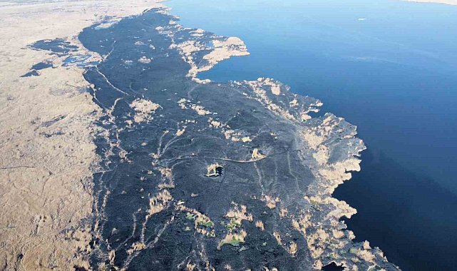 Eber Gölü'nün Afyonkarahisar'ın Çay ilçesi sınırlarında kalan bölümündeki sazlık alanda dün çıkan yangın güçlükle söndürülürken zarar gören 40 futbol sahası büyüklüğündeki alan havadan görüntülendi.Edinilen bilgilere göre, Çay ilçesi Eber beldesi yakınlarında gölün sazlık alanlarından dumanlar çıktığını gören çevre sakinleri durumu itfaiyeye bildirdi. İhbar üzerine bölgeye çok sayıda itfaiye ekibi sevk edilirken yangına karadan müdahale başladı. Gölden yükselen alevler ve duman kilometrelerce uzaklıktan görülürken yangın sabaha karşı güçlükle söndürüldü."Birçok habitat zarar gördü"Yangının ardından günün ağarmasıyla facianın boyutu gün yüzüne çıktı. Olayda 40 futbol sahası büyüklüğünde alanın zarar gördüğü belirtilirken birçok kuş türü başta olmak üzere hayvanların da telef olduğu kaydedildi. Eber Gölü Alan Kılavuz ve Rehberi Kadir Ateş, yangının Eber beldesi istikametinde öğle saatlerinde başladığını ifade etti. Ateş, "Yangın gece kendi kendine söndü. 40 futbol sahasından büyük bir alan yandı ve içerisindeki birçok habitat zarar gördü" dedi.
