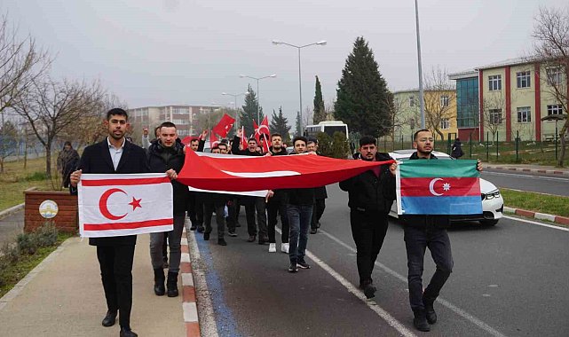Geçtiğimiz günlerde 12 askerin şehit olduğu Irak'ın kuzeyindeki terör saldırılarını kınamak amacıyla bir araya gelen Trakya Üniversitesi Türk Dünyası Kültür Araştırmaları Topluluğu üyesi öğrenciler, ellerinde Türk, Kuzey Kıbrıs Türk Cumhuriyeti, Azerbaycan bayrakları taşıyıp sloganlar eşliğinde yürüyüş yaptı.Trakya Üniversitesi Balkan Yerleşkesi Bolca Ana Yemekhanesi önünde bir araya gelen Trakya Üniversitesi Türk Dünyası Kültür Araştırmaları Topluluğu üyesi öğrenciler, sloganlar eşliğinde yürüyüş yaparak terörü lanetledi.Türkan Sabancı Kültür Merkezi önüne kadar yürüyüş yapan öğrenciler, burada bir basın açıklamasında bulundu.Grup adına açıklamayı okuyan Trakya Üniversitesi Türk Dünyası Kültür Araştırmaları Topluluğu Başkanı Mustafa Demir, Milli hassasiyetleri körelen Türk milletini yeniden canlandırarak ayağa kaldırmanın gençlerin elinde olduğuna dikkat çekti.Hainlerin savurduğu tehditlerden korkmadıklarını belirten Demir, "Yöneltecekleri her türlü saldırıyı da iman dolu göğsümüzde durduracağımızı beyan ediyoruz. Türk milliyetçisi öğrenciler olarak, dağlarda, mecliste ve kampüslerde yuvalanan tüm teröristlere karşı mücadelemiz, son nefer, son nefes ve son damla kana kadar olacak. Şu hiçbir zaman unutulmasın ki, bizler, "Vatanını en çok seven, görevini en iyi yapanadır" şiarıyla hareket eden Türk milliyetçisi öğrenciler olarak, memleketimizin hiçbir zaman gerilemesine izin vermeyeceğiz" şeklinde açıklamada bulundu."Tüm şehitleri rahmetle anıyoruz"Tüm şehitleri rahmetle andıklarını söyleyen Demir, "Büyük Türk milletine başsağlığı diliyorum. Doğum sancısı çeken bu topraklar üzerinde artık biz ölmeyeceğiz" dedi.