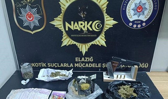 Elazığ Cumhuriyet Başsavcılığı koordinesinde İl Emniyet Müdürlüğü Narkotik Suçlarla Mücadele Şube Müdürlüğü tarafından uyuşturucu ile mücadele çerçevesinde sokak satıcılarına yönelik çalışma gerçekleştirildi. Yapılan çalışmalarda, B.Y. (20) isimli şahsın uyuşturucu madde temin ettiğinin tespit edilmesi üzerine üst aramasında ve Nina isimli narkotik köpeği ile yapılan ikamet aramasında 10 parça halinde toplam 505,35 gram esrar maddesi, 1 adet sentetik ecza, 1 adet ruhsatsız tabanca ve tabancaya ait 2 adet fişek ele geçirildi.