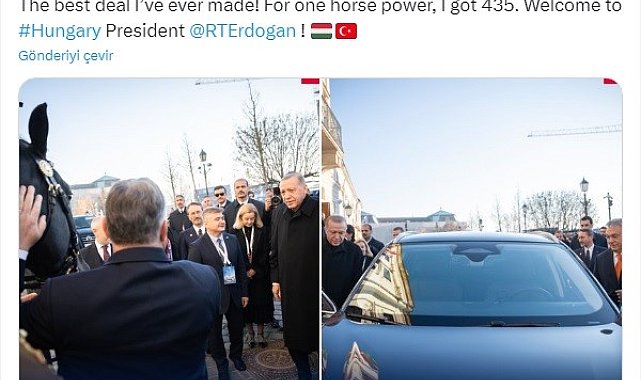 Cumhurbaşkanı Recep Tayyip Erdoğan'ın dün gerçekleştirdiği ziyaretinde Togg hediye ettiği Macaristan Başbakanı Viktor Orban, sosyal medya hesabından yaptığı paylaşımda, kendisinin de Macar atı hediye ettiğine işaret ederek, "Yaptığım en iyi anlaşma. Bir beygir gücü karşılığında 435 beygir gücü elde ettim" ifadelerini kullandı.Cumhurbaşkanı Recep Tayyip Erdoğan, resmi temaslarda bulunmak üzere dün gittiği Macaristan'ın başkenti Budapeşte'de Macaristan Başbakanı Viktor Orban ile bir araya geldi. Erdoğan, Karmelita Manastırı'nda kendisini karşılayan Başbakan Orban'a yerli ve milli imkanlarla üretilen Oltu siyahı renginde ve iki ülke arasındaki ilişkilerin 100. yılına özel hazırlanan "HU TR-100 plakalı" Togg hediye etti. Başbakan Orban da Cumhurbaşkanı Erdoğan'a Macar atı hediye etti. Orban, daha sonra sosyal medya hesabından Erdoğan'ın Togg, kendisinin Macar atı hediye etmesine ilişkin gülümseten bir paylaşım yaptı. Togg ve Macar atının yer aldığı fotoğrafları paylaşan Orban, "Yaptığım en iyi anlaşma. Bir beygir gücü karşılığında 435 beygir gücü elde ettim" ifadelerini kullandı.