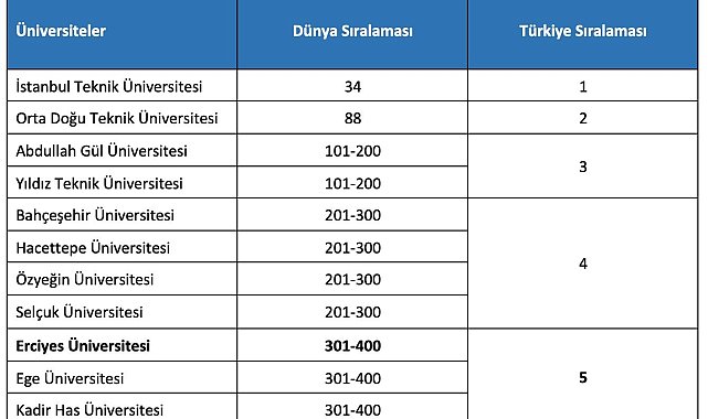 Dünyada 121 ülkeden 1963 üniversitenin katıldığı bu uluslararası sıralamada ERÜ 301-400 aralığında yer alırken, ulusal sıralamada ise Ege Üniversitesi ve Kadir Has Üniversitesi ile birlikte 9. sırada ve devlet üniversiteleri içinde ise 7. sırada yer aldı.