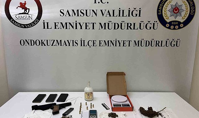 Samsun'da polis tarafından evlerinde uyuşturucu ele geçirilen 2 kişi gözaltına alındı.Edinilen bilgiye göre, Samsun'un 19 Mayıs ilçesinde polis uyuşturucu ticareti yaptıkları tespit edilen M.D. ve K.A.'nın evlerine operasyon düzenlendi. Yapılan aramalarda, 2 adet hassas terazi, 60 gram esrar, 1 adet ruhsatsız tabanca ve 10 adet fişek ile uyuşturucu madde sarmada kullanılan çeşitli malzemeler ele geçirdi. Olayla ilgili M.D. ve K.A. gözaltına alındı. Soruşturma devam ediyor.