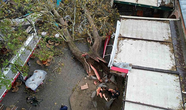 Bursa'da saatteki hızı 100 kilometreye ulaşan şiddetli fırtına tarihi Kozahan'daki 250 yıllık çınar ağacını kökünden söktü. Olayın gece yaşanması muhtemel faciayı önlerken, kafeteryalar da çınarın kırılan devasa dallarıyla zarar gördü. Devrilen çınarın görüntüsü dron ile görüntülendi.