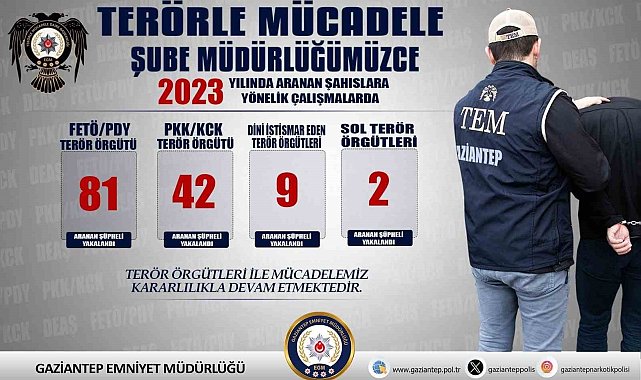 Gaziantep'te FETÖ/PDY ve PKK/KCK terör örgütlerine üye olmak suçundan aranan 123 şüpheli şahıs yakalandı.Gaziantep İl Emniyet Müdürlüğüne bağlı Terörle Mücadele Şube Müdürlüğü ekipleri, FETÖ/PDY silahlı terör örgütünün eylem ve faaliyetlerinin engellenmesi, örgüt mensuplarının yakalanmasına yönelik yaptığı operasyonda FETÖ/PDY üyesi olmaktan aranan 81 şüpheli şahıs ve PKK/KCK silahlı terör örgütüne yönelik yürütülen çalışmalarda ise 42 aranan şahıs yakalandı.