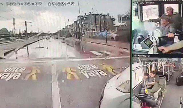 Antalya'da hafif ticari araç ile halk otobüsün çarpışması sonucu meydana gelen kazanın güvenlik kamera görüntüsü ortaya çıktı. Hafif ticari araçtaki sürücünün sıkışmasına neden olan kazada, seyir halinde giden halk otobüsünün önüne birden ticari aracın çıkması, kaza sonrası yolcuların büyük panik yaşaması görüntülere yansıdı.Kaza, dün saat 13.22'de Kepez ilçesi Gündoğdu Mahallesi Yeşilırmak Caddesi'nde meydana geldi. Edinilen bilgiye göre, 07 AU 0402 plakalı Abdülkadir Koşu (58) idaresindeki halk otobüsü ile İsmail Kondu (39) idaresindeki 06 CLP 049 plakalı hafif ticari araç, Seyhan Caddesi ile Yeşilırmak Caddesi kesişiminde çarpıştı. İhbar üzerine kaza yerine sağlık, itfaiye ve polis ekipleri sevk edildi. İtfaiye ekibinin yaptığı kontrolde, hafif ticari aracın sürücüsü İsmail Kondu'nun araçta sıkıştığı belirlendi. İtfaiye ekiplerinin kısa sürede müdahalesi ile şoför sıkıştığı yerden çıkartılarak sağlık ekiplerine teslim edildi. Yaralı şoför ambulans ile hastaneye kaldırılırken, otobüste ise yaralanan olmadı. Polis ekipleri yolu kısmen trafiğe kapatırken, kazayla ilgili çalışma başlatıldı.Halk otobüsü şoförü Abdülkadir koşu, "Sağ şeritten geliyordum, Kepez kent meydanından ilerleyen hafif ticari aracın şoförü yola çıktı. Onu görür görmez kendimi sola attım ama kaza oldu, yapacak bir yok" dedi.Kaza anı kameradaKaza anıysa halk otobüsünün kameralarına saniye saniye yansıdı. Görüntülerde seyir halinde giden halk otobüsünün önüne bir anda hafif ticari aracın çıkması ve çarpışmanın şiddetiyle otobüsün içerisindeki yolcuların panik anları yer aldı.