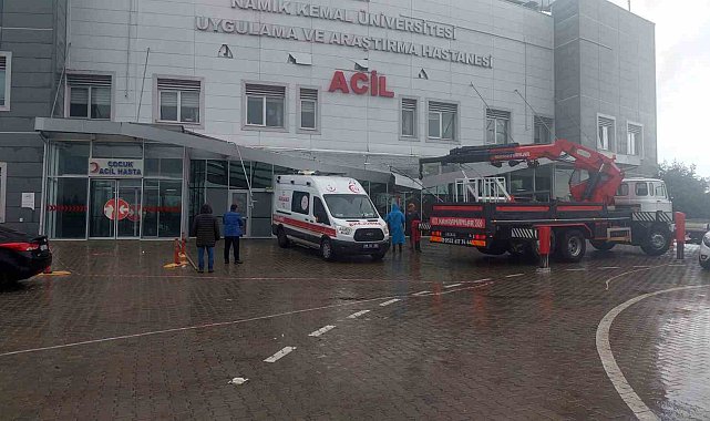Tekirdağ Namık Kemal Üniversitesi Sağlık Uygulama Ve Araştırma Hastanesinin acilin girişindeki tavan fırtına ve şiddetli yağışlar sebebiyle ambulansın üzerine çöktü.Tekirdağ'da lodos fırtınasının şiddeti azalırken bu seferde kentte şiddetli yağışlar yaşanıyor. Fırtına ve yağış, Tekirdağ Namık Kemal Üniversitesi Sağlık Uygulama Ve Araştırma Hastanesinin acilini de vurdu. Acilin girişindeki tavan fırtına ve yağış sebebiyle o sırada alanda hasta için bekleyen bir ambulansın üzerine çöktü.Olayda herhangi bir can kaybı yada yaralanma olmayışı rahat bir nefes aldırırken, olay yeri hasta girişine kapatılarak şerit çekildi. Bölgeye çağrılan vincin yardımıyla tavan kaldırılarak altta kalan ambulansın kurtarılması sağlandı. Ambulansta maddi hasar meydana gelirken, acilin girişindeki tavanın onarımı için çalışma başlatılacak.