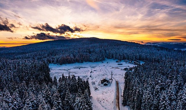 Geçtiğimiz hafta etkili olan kar yağışı dolayısıyla beyaz örtüyle kaplanan Bolu'nun yüksek kesimleri havadan görüntülendi. Muhteşem görüntülerin ortaya çıktığı manzara görenleri mest etti.Bolu'da geçtiğimiz hafta yüksek rakımlı mevkilerde kar yağışı etkili oldu. Kar yağışı dolayısıyla Aladağlar, Sarıalan Yaylası, Köroğlu Dağları beyaz örtüyle kaplandı. Karlar içerisinde kalan çam ağaçları gün batımında havadan görüntülendi. Ortaya çıkan görüntülerde çam ağaçlarının üzerindeki karlar ve gün batımı manzarası görenleri mest etti. Gün batımındaki renk cümbüşü, görsel şölen oluşturdu.Hava sıcaklıklarının Aladağlar, Sarıalan Yaylası, Köroğlu Dağları sıfırın altında seyretmesi dolayısıyla bölgedeki karlar yeşil alanlarda durmaya devam ediyor.