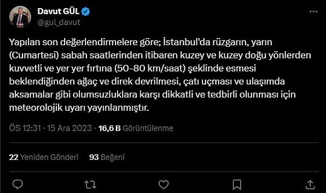 İstanbul Valilisi Davut Gül, kentte Cumartesi günü fırtına beklendiğini belirterek, vatandaşları dikkatli olmaları konusunda uyardı.İstanbul Valisi Davut Gül, sosyal medya hesabından yaptığı açıklamada son değerlendirmelere göre İstanbul'da yarın şiddetli rüzgarın etkili olmasının beklendiğini ifade etti. Gül açıklamasında, " Yapılan son değerlendirmelere göre; İstanbul'da rüzgarın, yarın (Cumartesi) sabah saatlerinden itibaren kuzey ve kuzey doğu yönlerden kuvvetli ve yer yer fırtına (50-80 km/saat) şeklinde esmesi beklendiğinden ağaç ve direk devrilmesi, çatı uçması ve ulaşımda aksamalar gibi olumsuzluklara karşı dikkatli ve tedbirli olunması için meteorolojik uyarı yayınlanmıştır" ifadelerini kullandı.