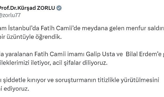İYİ Parti Sözcüsü Kürşad Zorlu, Fatih Camii'nde imama ve bir vatandaşa yapılan saldırıyı kınayarak, "Fatih Camii imamı Galip Usta ve Bilal Erdem'e geçmiş olsun dileklerimizi iletiyoruz" dedi.İYİ Parti Sözcüsü Kürşad Zorlu, Fatih Camii İmamı Galip Usta ve cami cemaatinden Bilal Erdem'in bir şüpheli tarafından bıçakla yaralanmasına ilişkin sosyal medya hesabından yaptığı açıklamada, "Bu akşam İstanbul'da Fatih Camii'nde meydana gelen menfur saldırıyı büyük bir üzüntüyle öğrendik. Saldırıda yaralanan Fatih Camii imamı Galip Usta ve Bilal Erdem'e geçmiş olsun dileklerimizi iletiyor, acil şifalar diliyoruz. Saldırıyı şiddetle kınıyor ve soruşturmanın titizlikle yürütülmesini temenni ediyoruz" dedi.