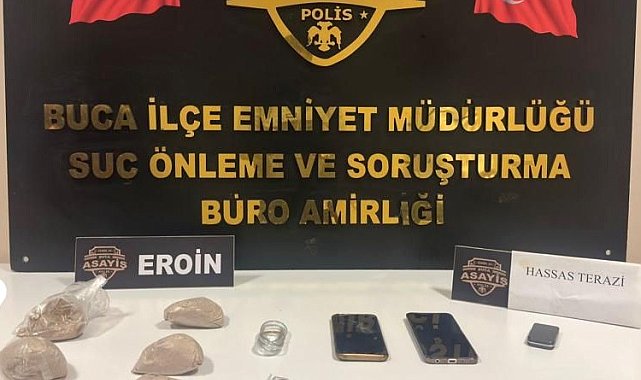 İzmir'in Buca ilçesinde, yarım kilodan fazla eroin ve hassas terazi ile yakalanan şahıs, çıkarıldığı mahkemece tutuklandı.Edinilen bilgiye göre, Buca İlçe Emniyet Müdürlüğü Narko Tim ekipleri zehir tacirlerine yönelik operasyonda 660 gram eroin ve hassas terazi ele geçirdi. Olayla ilgili yakalanan 1 şüpheli, 'uyuşturucu madde ticaretinden' çıkarıldığı mahkemece tutuklandı.