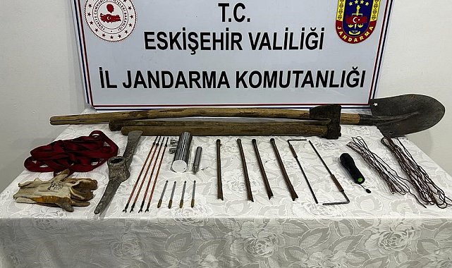 Eskişehir'de izinsiz kazı yaptığı tespit edilen 2 kişi jandarma ekiplerince suçüstü yakalanırken, kazıda kullanılan birçok malzeme ele geçirildi.Edinilen bilgilere göre, Tepebaşı İlçesi Çalkara Mahallesi'nde kaçak kazı yapacağı tespit edilen şahısların yakalanması amacıyla İl Jandarma Komutanlığı'na bağlı Kaçakçılık ve Organize Suçlarla Mücadele (KOM) Şube Müdürlüğü ekiplerince çalışma düzenlendi. KOM Şube Müdürlüğü ve Tepebaşı İlçe Jandarma Komutanlığı ekiplerince yapılan ortak operasyon sonucu kaçak kazı yaptığı tespit edilen 2 şahıs suçüstü yakalandı. Kazı alanında yapılan incelemede, 1 adet alan tarama cihazı, 10 adet bakır çubuk, 9 metre kablo, 1 adet kazma, 1 adet kürek, 6 metre halat ve 2 adet muhtelif kazı malzemesi ele geçirildi.Tepebaşı İlçe Jandarma Komutanlığı ekiplerince gözaltına alınan 2 şüpheli hakkında 'Kültür ve Tabiat Varlıkları Koruma Kanununa Muhalefet' suçundan adli işlem başlatıldığı öğrenildi.