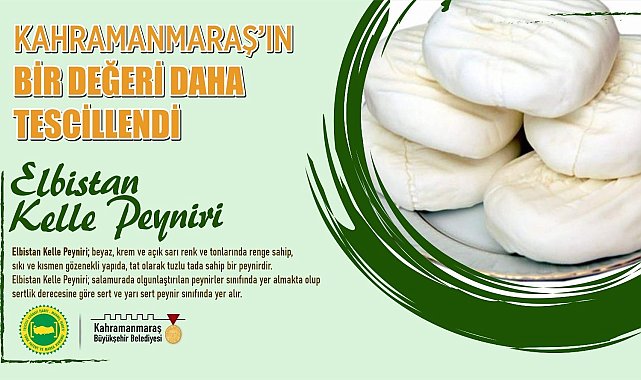Büyükşehir Belediyesi tarafından Türk Patent ve Marka Kurumuna yapılan başvuruyla Elbistan Kelle Peyniri'nin tescili alındı. Elbistan Kelle Peyniri, şehrin 27. tescilli ürünü olarak yerini aldı.Yeni Kahramanmaraş vizyonu doğrultusunda paydaş kurum ve kuruluşlarla tüm alanlarda faaliyetlerini sürdüren Kahramanmaraş Büyükşehir Belediyesi, şehrin yöresel lezzetlerini ve geleneksel el sanatlarını koruyarak ulusal ve uluslararası arenada tanıtımını sağlamak için de tescil başvurularını sürdürüyor. Son olarak Ekim ayında tescil ettirilen Kahramanmaraş Bertiz Kabarcık Üzümü'nün ardından şimdi de Elbistan Kelle Peyniri'nin coğrafi işaret tescili alındı. Kendine özgü üretim metoduyla Elbistan Kelle Peyniri; KSÜ Mühendislik ve Mimarlık Fakültesi Gıda Mühendisliği Bölümü ile Elbistan İlçe Tarım ve Orman Müdürlüğünün destekleriyle Büyükşehir Belediyesi tarafından yapılan başvurunun ardından Türk Patent ve Marka Kurumunca hazırlanan 162 Sayılı Resmi Coğrafi İşaret ve Geleneksel Ürün Adı Bülteni'nde yayımlanarak şehrin 27. tescilli ürünü olarak yerini aldı.Mahalle, Tarım ve Hayvancılık Dairesi Başkanlığından yapılan açıklamada; "Yöresel lezzetlerimize ve geleneksel el sanatlarımıza sahip çıkarak coğrafi işaret tescilli ürünlerimizin sayısını artırmak için çalışmalarımızı sürdürüyoruz" ifadelerine yer verildi.